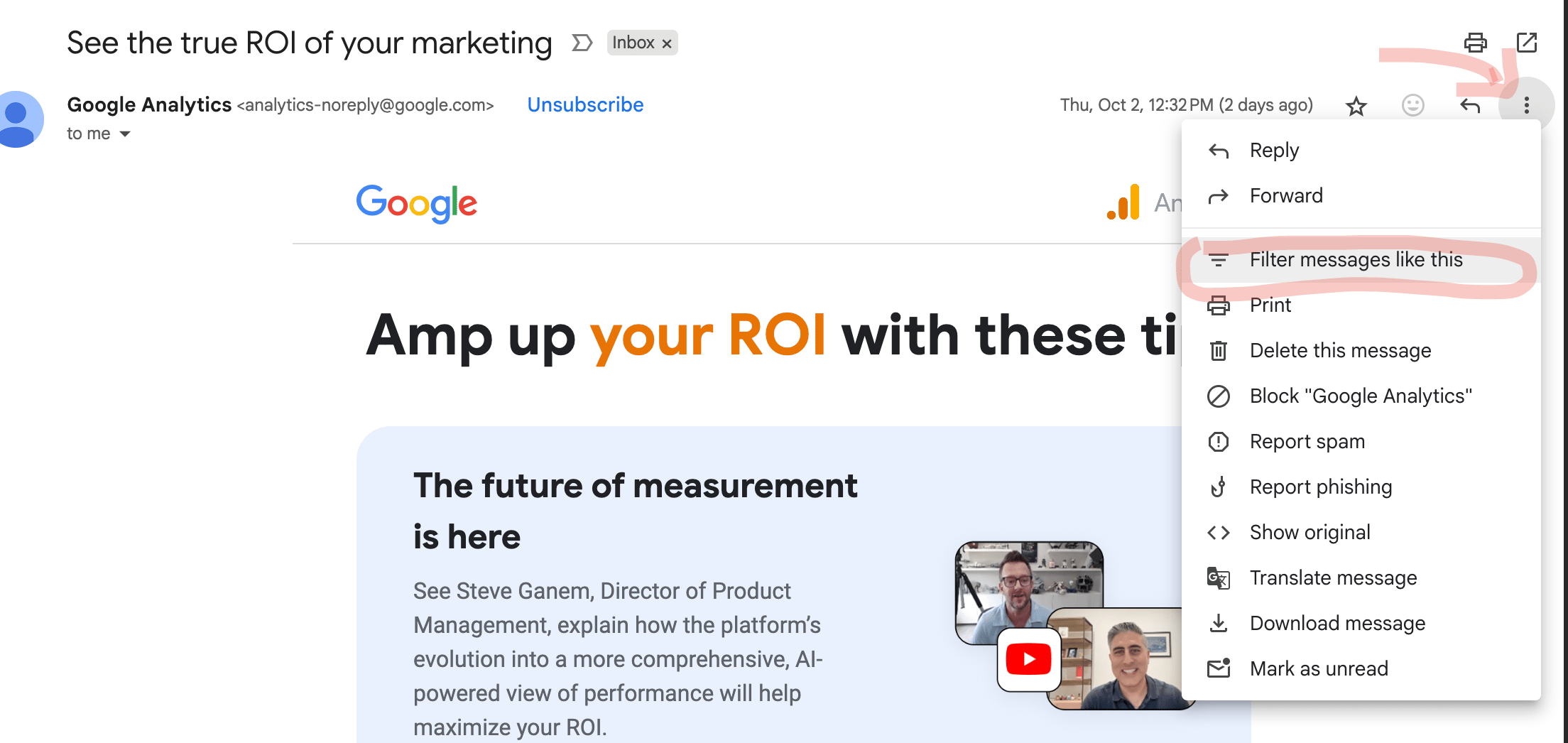 I use Google Business Suite, so this will be Google-based, but it should work for other email service providers. Go to Gmail. Find any client email. Click the three dots. "Filter messages like these."